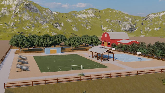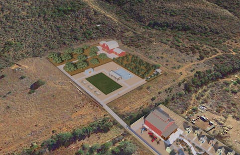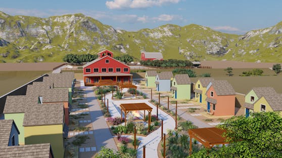 The large red house will be a gathering house for Chapel, congregations, staff quarters and a nursery for young children. There will be an industrial kitchen and dining hall for everyone to be together. There will be devotionals, fire pits and teachings in the center of the courtyard.